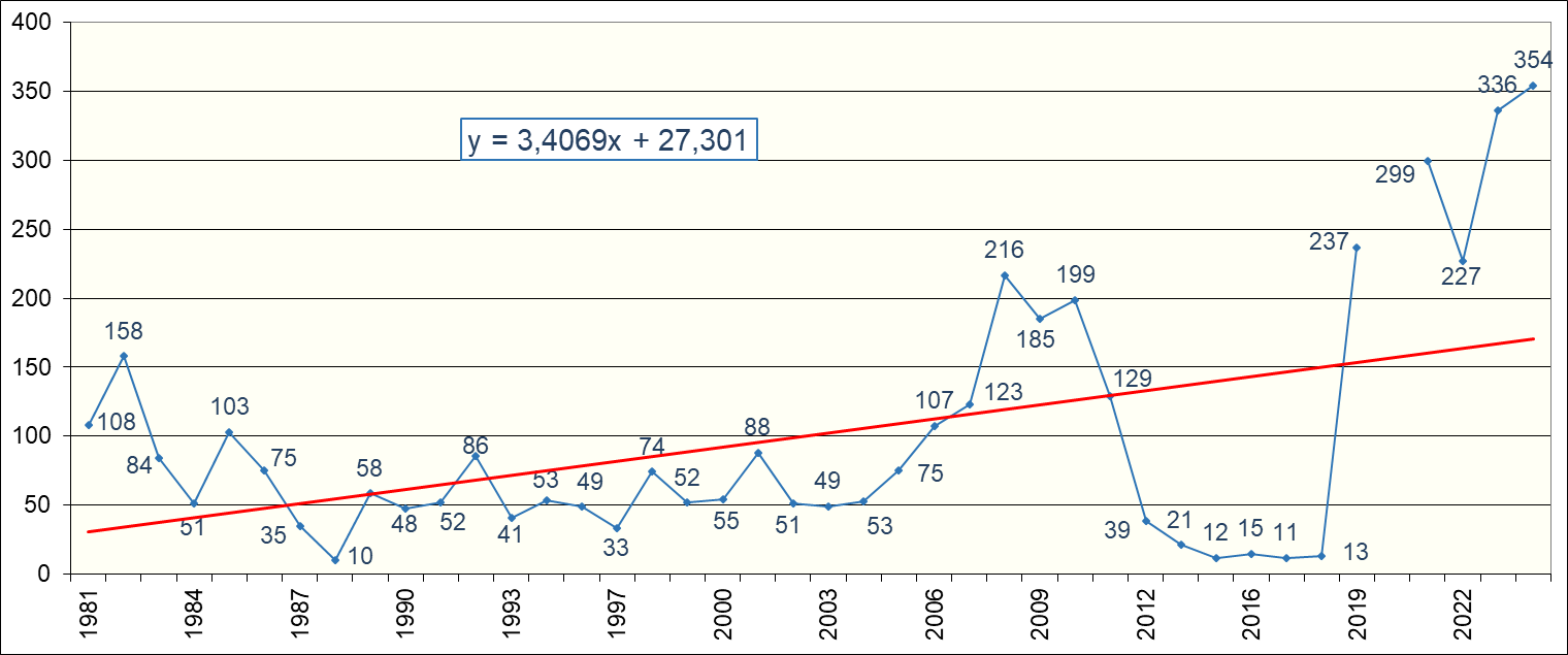 Как и ранее, среди загрязняющих веществ в 2023 г. приоритетными оставались фенолы. Анализ межгодовой изменчивости концентрации фенолов за весь период наблюдений начиная с 1981 г. указывает на наличие отрицательного линейного тренда. Основное уменьшение концентрации фенолов приходилось на 1981-2003 гг. тогда как в более поздний период ее заметного систематического изменения не наблюдалось