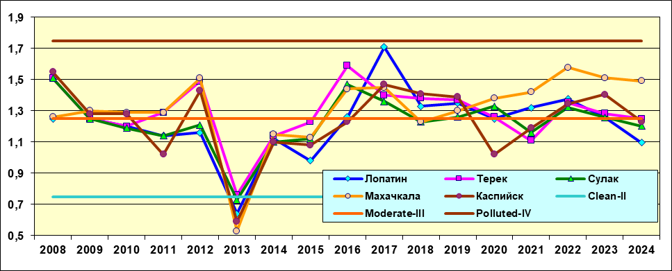 Многолетняя динамика ИЗВ за период 2000-2024 гг. свидетельствует об отсутствии какой-либо выраженной тенденции изменения качества вод в рассматриваемом районе. Практически во все годы ИЗВ находился в диапазоне значений умеренно-загрязненных вод (III класс качества). Исключение составили 2017 и 2022 гг, когда значение ИЗВ вышло за верхний предел этого класса и достигло уровня загрязненных вод. Другим исключением стал 2008 г. с нетипично низким значением ИЗВ (0,58). Скорее всего, это было связано с отсутствием в этом году наблюдений за фенолами, вносящими наибольший вклад в величину индекса в водах южной части Северного Каспия.