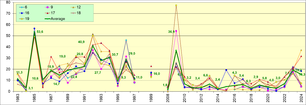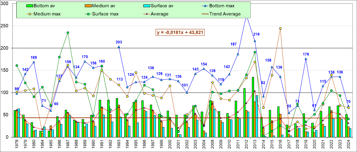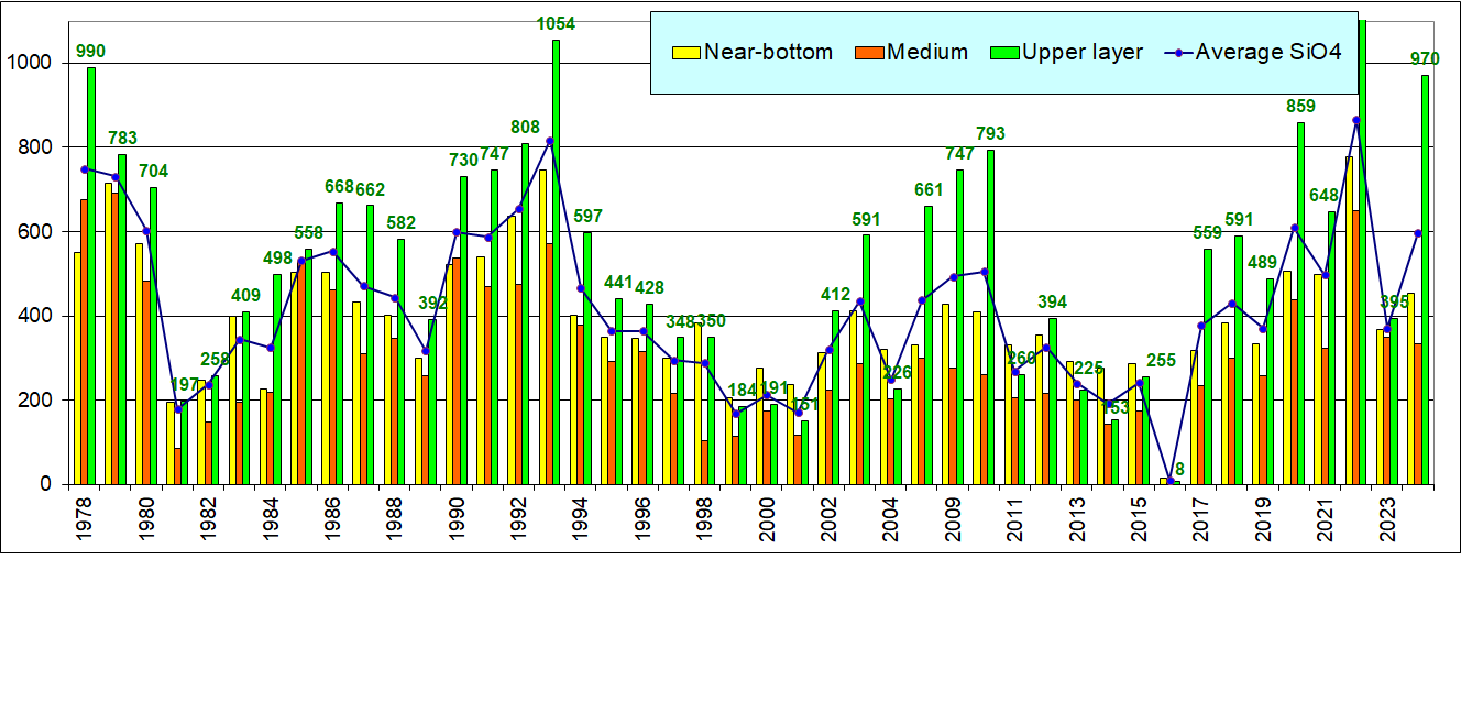 Концентрация силикатов в среднем повысилась по сравнению с прошлым годом, в силу резкого увеличения содержания в поверхностном слое. В целом в режиме многолетней динамики содержания кремнекислоты очевидно выделяются циклические подъемы и спады примерно 11-летнего периода.