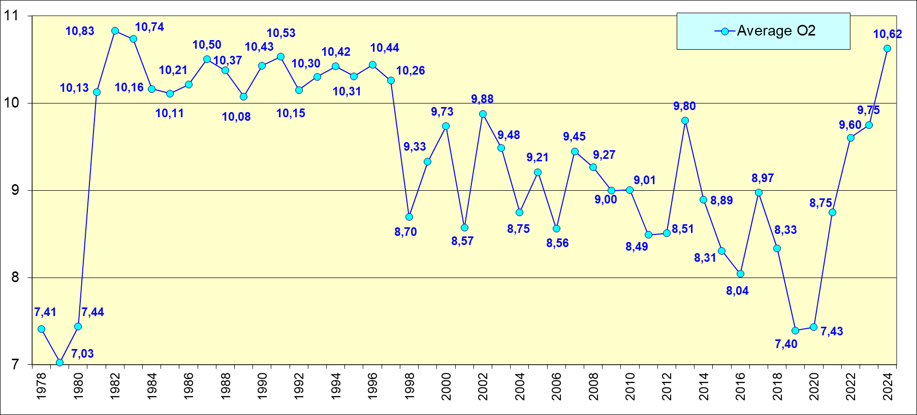 Содержание кислорода после понижения в 1998-2020гг возвратилось в 2024г. к высоким значениям