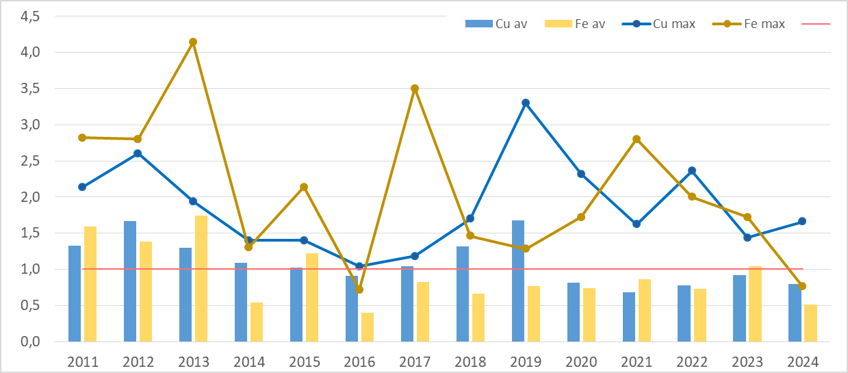 Медь и железо до 2020г. были приоритетными ЗВ, пока вклад биогенов не стал превалирующим. При большой межгодовой изменчивости наблюдается циклическая зависимость от времени. К 2024г. и максимальные, и средние значения снизились.