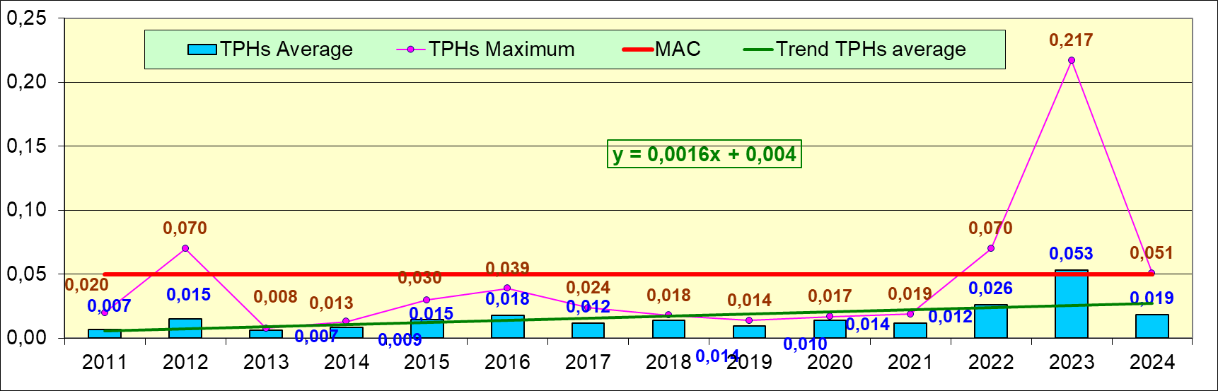 В период 1978-2000 гг. средние значения содержания нефтяных углеводородов почти постоянно достигали или превышали 1 ПДК. Начиная с 2008 г. концентрация НУ в водах Двинского залива существенно снизилась. В этот период за счет большого количества проб, в которых содержание НУ не достигало предела обнаружения используемого метода химического анализа, средняя величина обычно составляла менее половины норматива. Однако экстремальные «выбросы» в отдельных пробах достигали значений порядка 1-2,5 ПДК, максимум в 2023 г. составил 2,48 ПДК, а в 2024г. содержание НУ резко снизилось. И среднее, и максимальное значение содержания НУ стало минимальным за последние 6 лет. Тренд в период 2008-2024 гг. не выявлен.