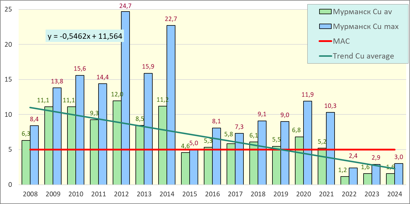 Содержание меди в 2024г., как и в 2022, 2023 г было меньше ПДК, причем не только средние, но и максимальные значения. Как видим, в 2008-2014гг содержание меди было гораздо значительней. После 2021г. значения стали существенно меньше.