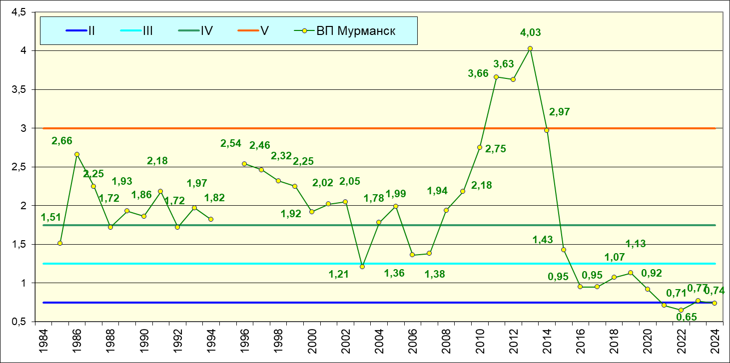 Индекс загрязненности вод в районе водпоста торгового порта г. Мурманска в период 1984-2022 гг. имел тенденцию к снижению после высоких значений 2008-2015 гг., в 2024 г. класс качества II, «чистые», как в 2021 и 2022гг.